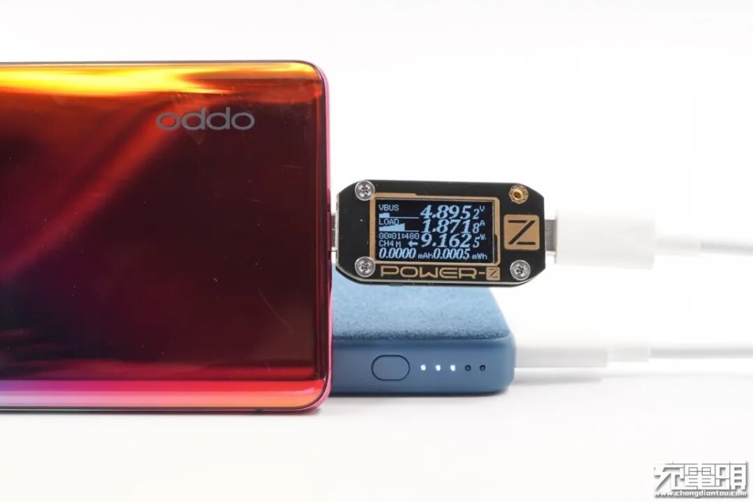 使用USB-C为小米9充电,功率为9.24W,同时使用USB-A为6.82W,移动电源支持双口同时输出为手机充电且均处于5V充电模式。