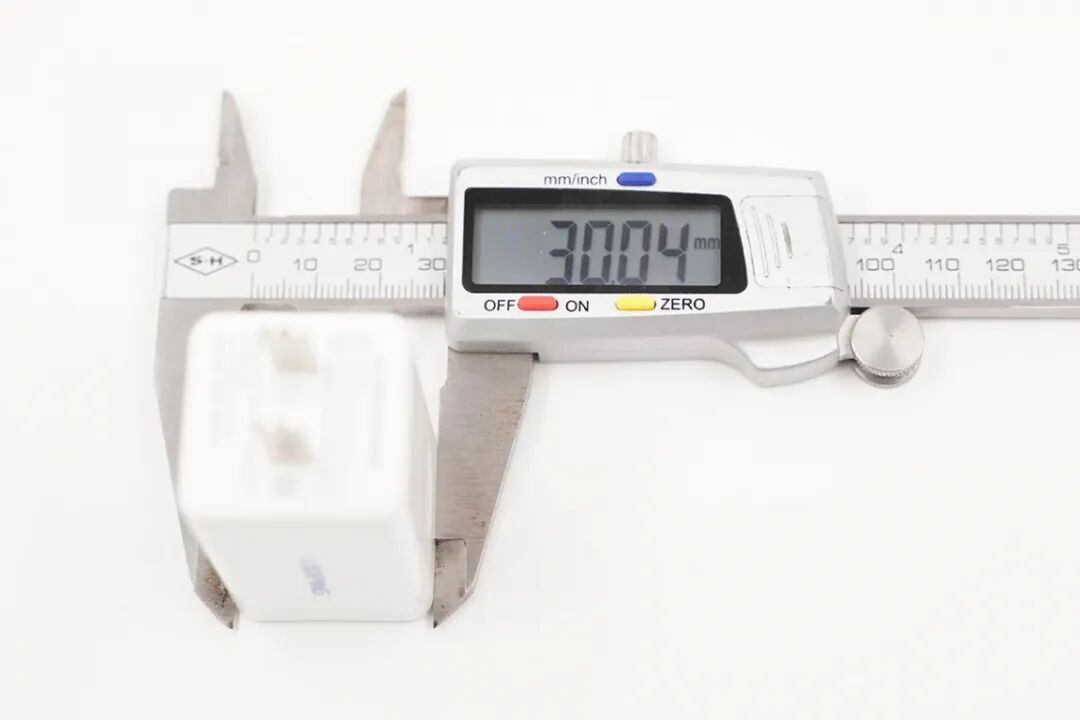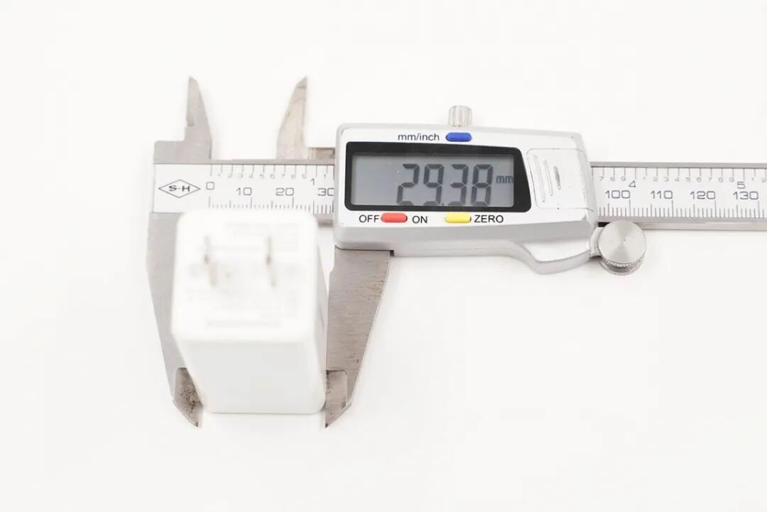 使用千分尺测量龙冰科技65W氮化镓充电器三围尺寸,宽度为29.38mm。