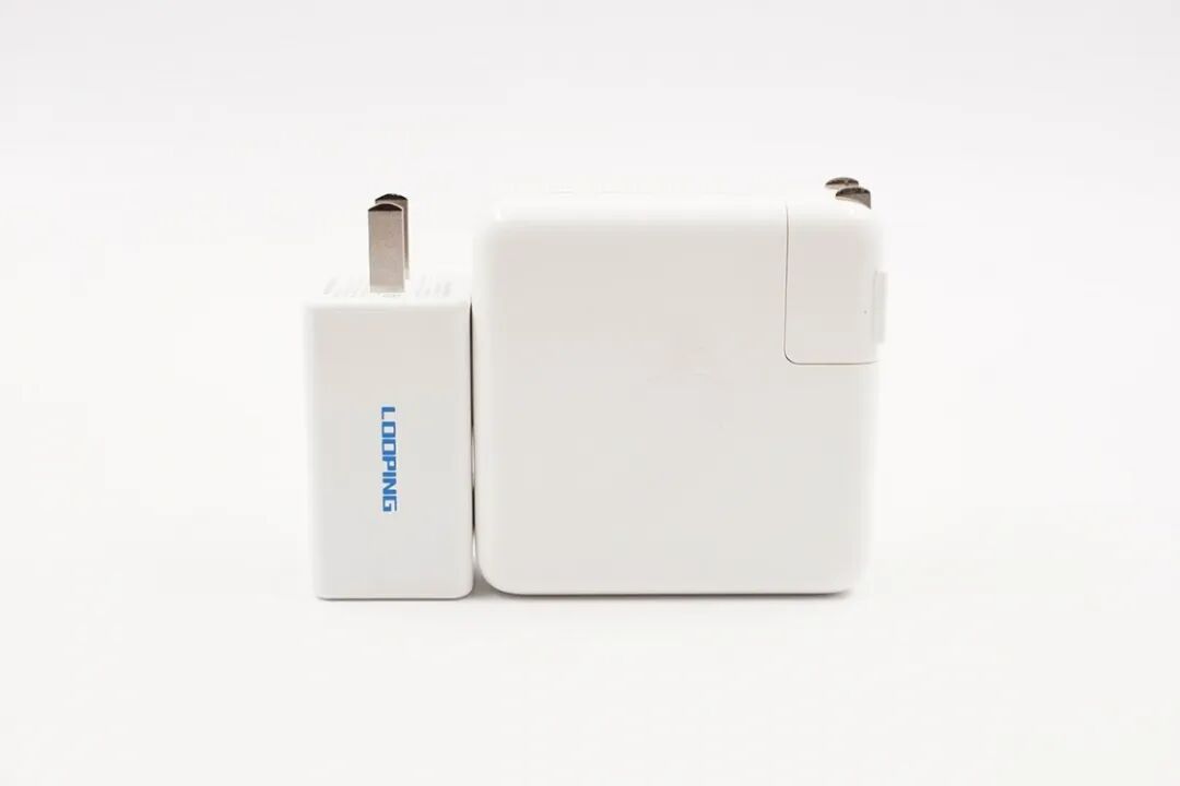 得益于氮化镓功率器件高频高效的优势,龙冰科技氮化镓充电器体积大幅度缩减的同时还能保证65W大功率输出,龙冰科技与苹果61W充电器放在一起,龙冰科技氮化镓充电器体积只有苹果的31%大小,并且龙冰科技功率还更加高,将氮化镓功率器件带来的优势发挥得淋漓尽致。