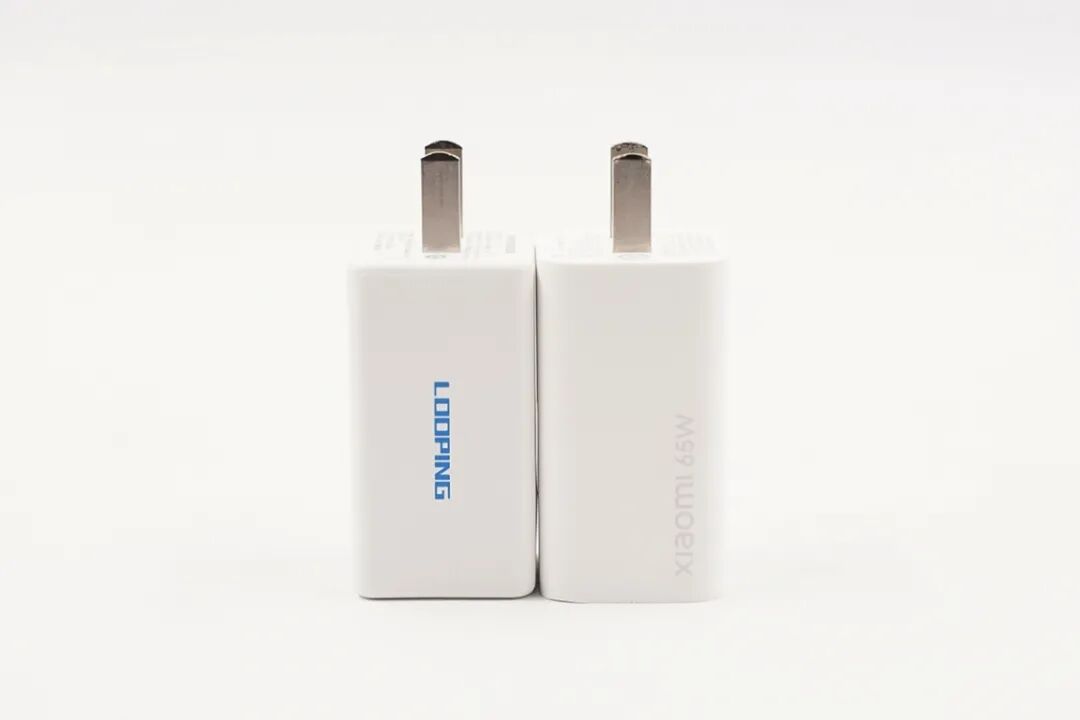 此前氮化镓充电器功率密度之最一直由小米保持着,小米氮化镓充电器三围尺寸30.8mm x 30.8mm x 56.3mm,功率密度1.21W/cm³,这次龙冰科技65W氮化镓充电器再将功率密度一举提升至1.30W/cm³,比小米密度还高。龙冰科技与小米并排站在一起,他们同为条形柱状设计,龙冰科技的三围尺寸以微小的优势胜出。