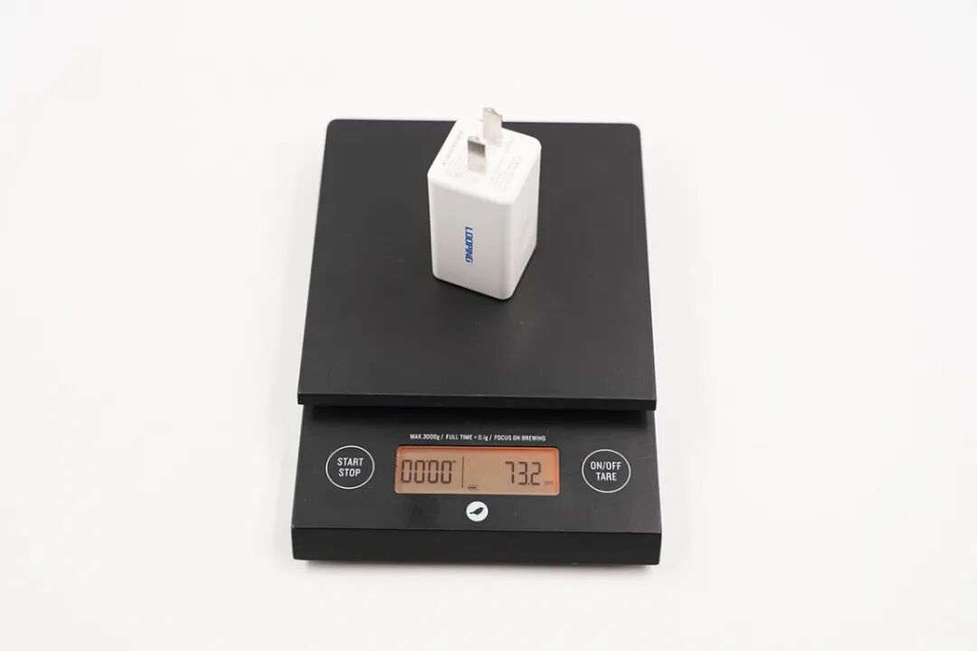 龙冰科技氮化镓充电器除了体积小巧,重量也达到了羽量级,电子秤测出来的重量只有73.2g,而同级的苹果61W充电器重量则高达208g,龙冰科技氮化镓充电器出门可减少不少携带压力。