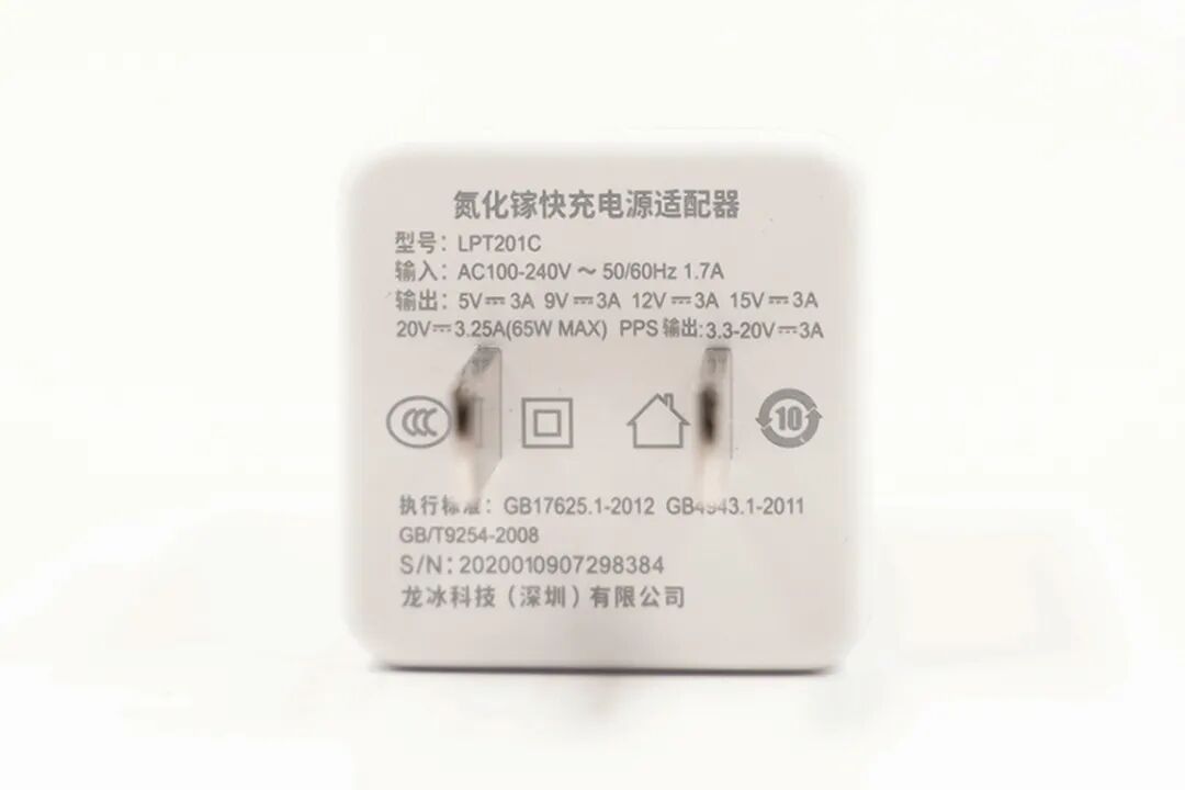 龙冰科技发布65W氮化镓充电器采用固定插脚,型号为LPT201C,输入支持全球电压100-240V 50/60Hz 1.7A,输出拥有完整的PDO电压档,分别是5V3A / 9V3A / 12V3A / 15V3A / 20V3.25A,还带有一组PPS电压3.3-20V3A,产品已取得CCC认证。