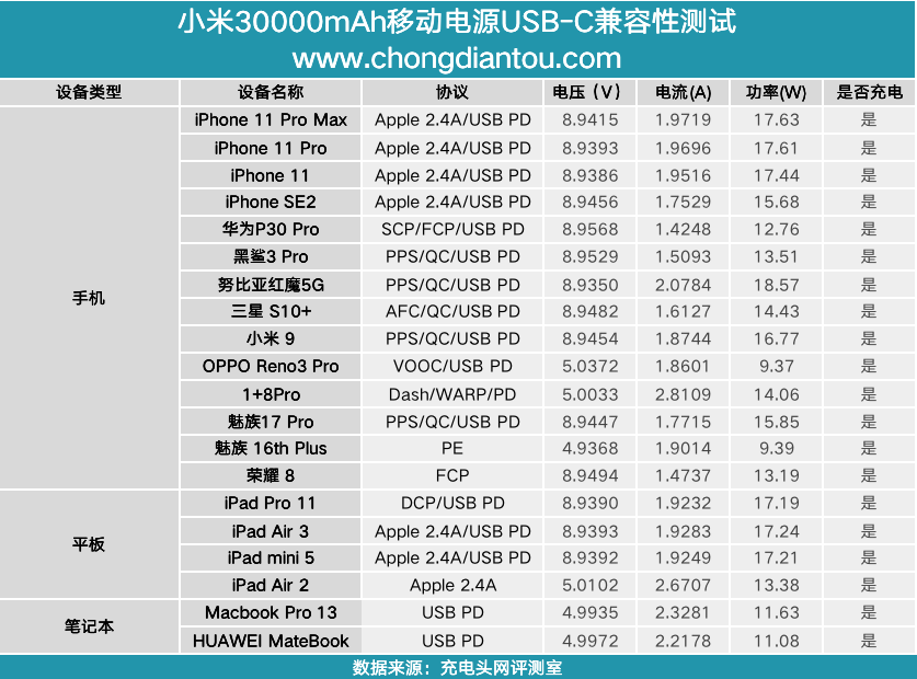 1、USB-C将测试的数据汇总到表格当中,支持PD快充的手机和iPad均可以握手PD3.0快充,iPad Air 2成功握手Apple2.4A快充协议,两台笔记本成功握手PD2.0快充协议。此外,USB-C还支持FCP快充协议。
