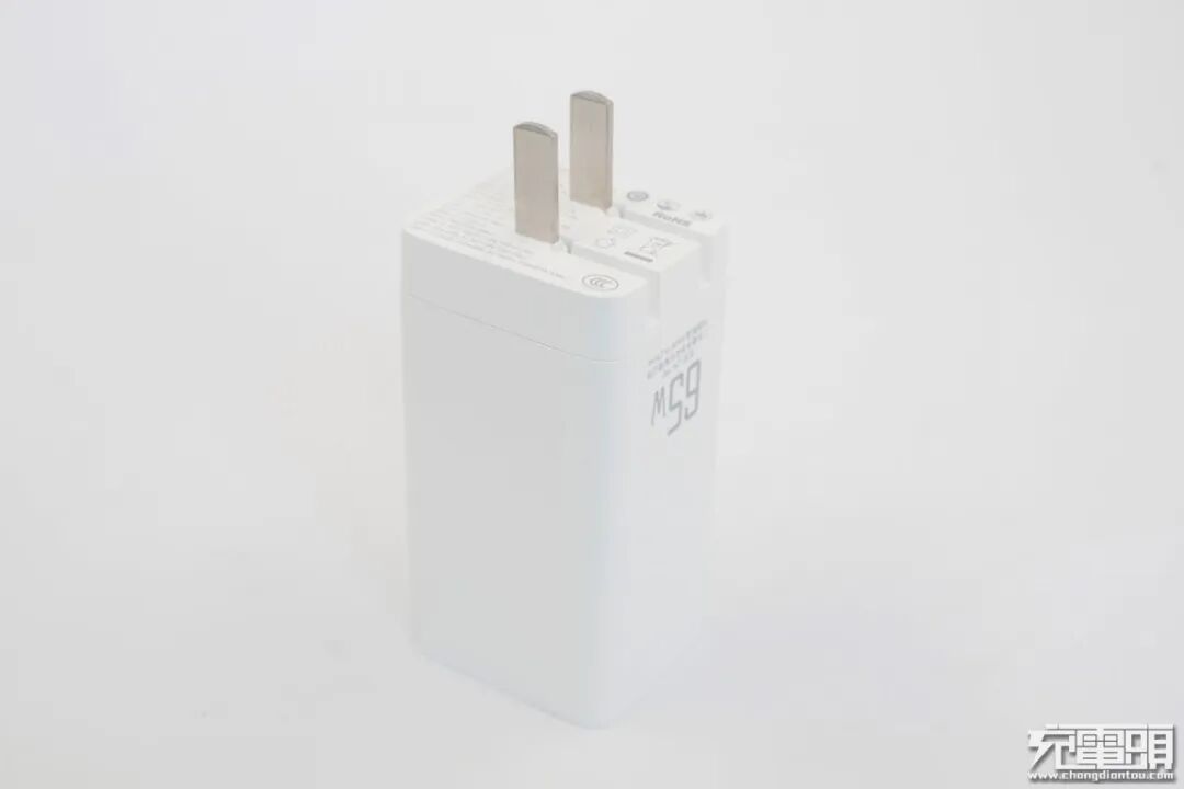 外观设计方面,麦多多65W氮化镓充电器采用了较为常见的长方形的设计,折叠插脚对于用户来说无论是出行携带还是收纳整理都是非常的方便。由体积参数可以得出充电器的功率密度为0.7W/cm³。