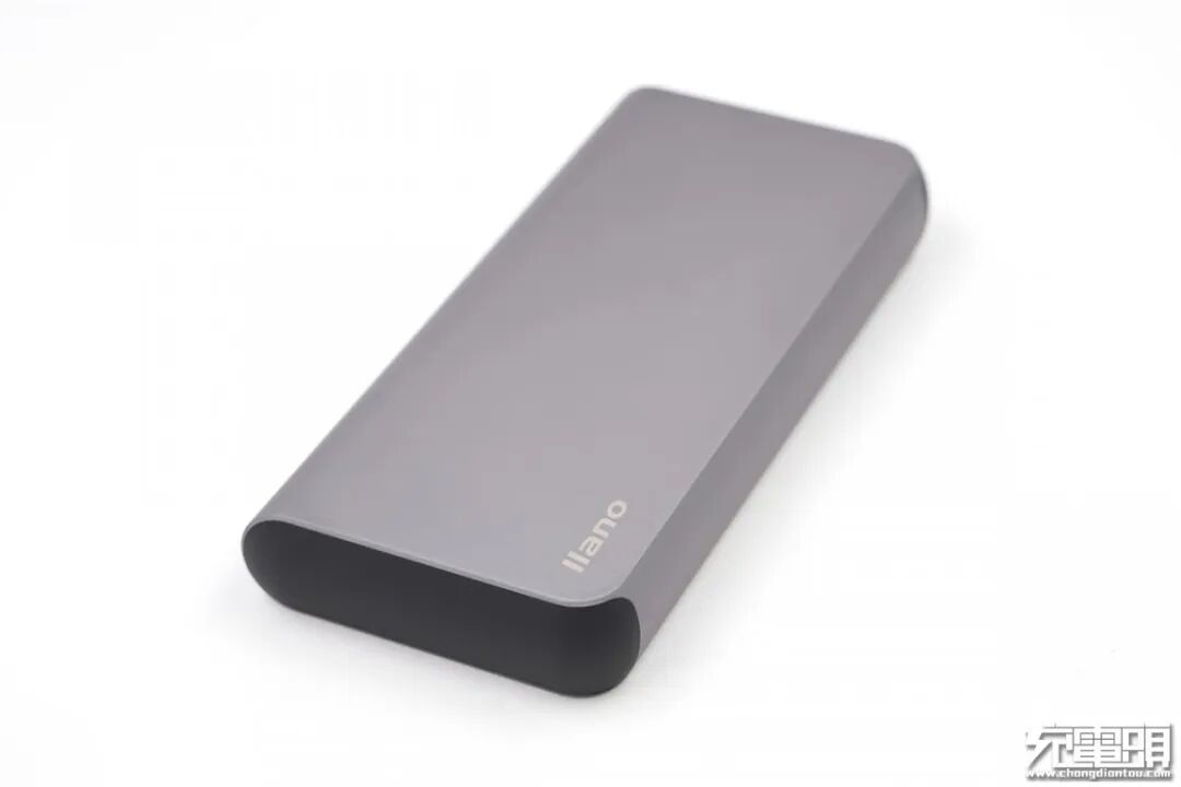 绿巨能100W PD移动电源为长方体,采用了金属外壳,颜色为灰色,外壳表面有轻微磨砂质感,高端商务风范尽显。正面左下角印制绿巨能LOGO:llano,设计十分简洁。