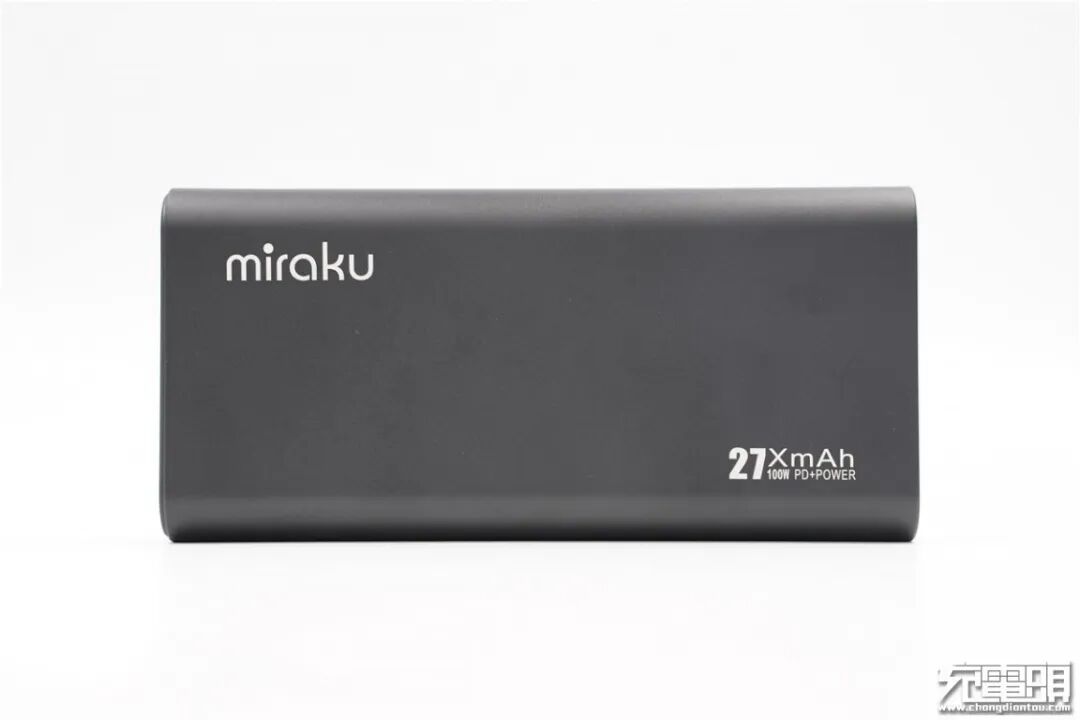 Miraku 100W PD移动电源采用铝合金外壳,表面黑色阳极氧化,轻微磨砂质感。移动电源正面左上角印制“Miraku”字样为产品品牌Logo,右下角印制“27XmAh 100W PD+Power”字样。