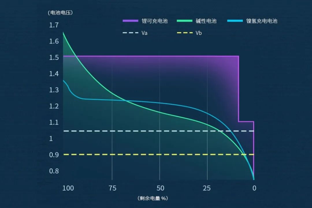 一次性电池随着剩余电量下降电压也同步下降,带载性能也随之降低,镍氢充电电池的的带载电压平台大部位处于1.2V左右的低平台,而京造可充锂电池因为内置升降压系统,具备恒压输出的特性,可以全程保持1.5V稳定电压输出,电量接近耗尽时电压调整至1.1V状态以提示设备进入低电量状态。