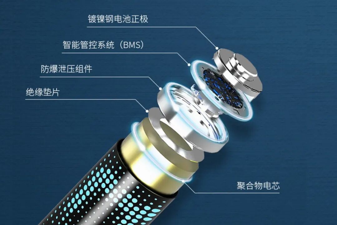 京造充电锂电池内部使用了高能量密度的锂聚合物电芯,通过头部的BMS电源管理系统进行升降压控制。安全性上具备过充保护、过放保护、短路保护、过热保护等等措施,并且内置防爆泄压阀确保使用安全。