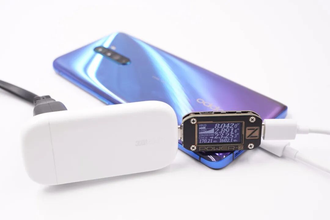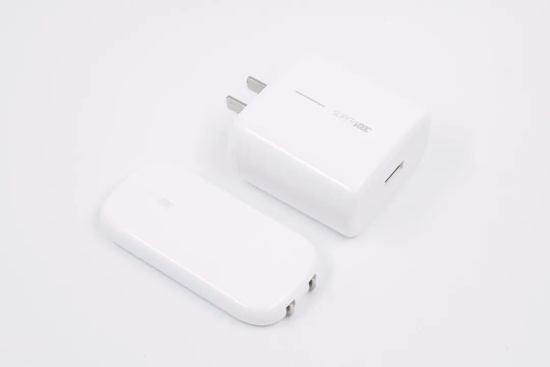 将测试的数据放在柱状图当中, OPPO Reno4和OPPO Ace2的充电功率最高。得益于氮化镓功率器件成功量产商用,大功率充电器小型化得以实现,让消费者可以享受这种新时代科技,很多读者非常关心氮化镓充电器发热量,所以我们加入了温升测试,但首先要明白几个温升测试小知识。充电器充电时的温度跟功率密度、效率值、内部方案设计、环境温度等等有关,功率密度低的产品因为体积大有足够的空间让元件布局隔开,表面温度会较低,但体积往往十分巨大。而功率密度高的产品,内部往往采用了立式插板元件堆叠等设计,尽可能地将充电器做小方便用户携带,理论上温度会比功率密度低的产品热。对OPPO 50W超闪饼干充电器的温升进行测试,测试条件为在温度约为25℃的恒温箱中以9V 3A 27W的功率持续输出半小时的温升情况进行测试,一小时后,当前最高温度为63℃,温升上升了38℃。不得不说,OPPO能以如此小的体积做到优秀的发热控制,这功夫,不赖!外观方面,OPPO 50W超闪饼干充电器通体白色,亮面材质搭配边角处圆润的过渡处理使得整个充电器在外观的颜值上值得加分。充电器整体呈扁长状,如鹅卵石一般,握在手中小巧玲珑,极具辨识度。采用这种设计的一大功臣是可折叠的插脚,既节省空间又防剐蹭。快充协议方面支持SuperVOOC、QC、PD 等快充协议,支持 5V 3A、 9V 3A 两个PD快充档位,额外还支持一组PPS档位:3.3-10V 3A。这款充电器通过内部特殊设计使产品体积大大缩小,功率密度无可比拟。既能极速闪充,也可轻松携带。VOOC平台创新性的将“充电接收端、发射端、充电端以及电池端”四个方面视为一体,软硬件都走定制化的道路,形成VOOC充电协议闭环,带给消费者良好的充电体验。OPPO此次推出的充电器是创造性的产物,要知道在如今如此小巧的氮化镓充电器中进一步的缩小体积是一件非常难的事情,OPPO不仅缩小体积,更朝着扁、平、薄发展,做出外形像饼干一样的杰作。总体来看,OPPO 50W超闪饼干充电器是里程碑式的产品。![]()