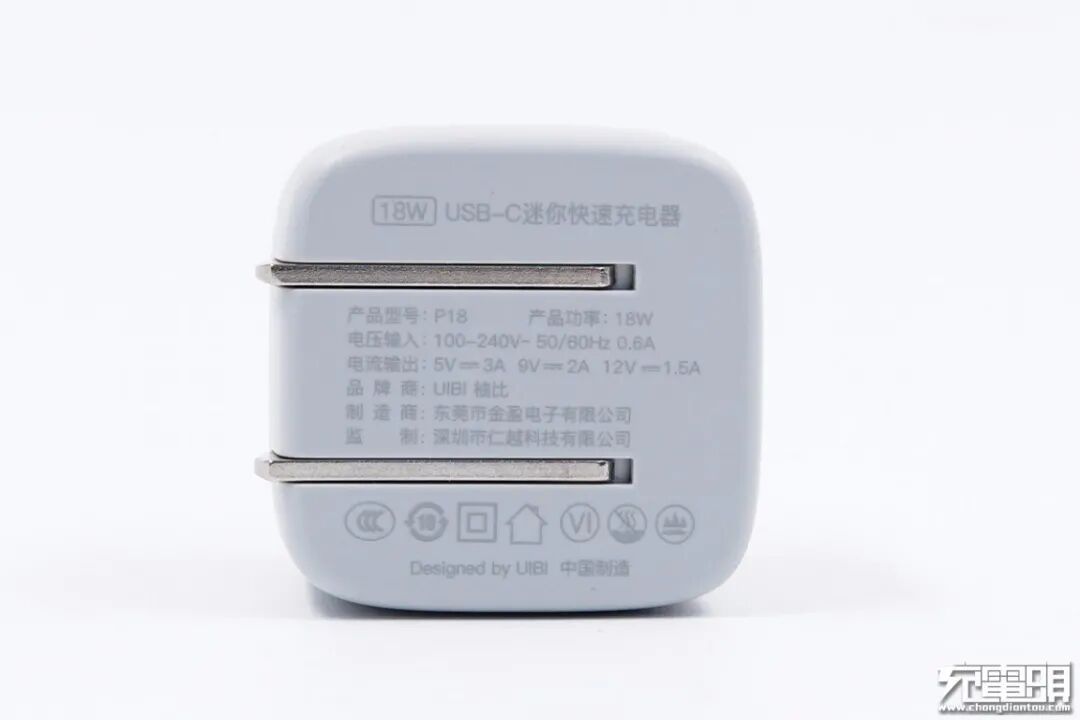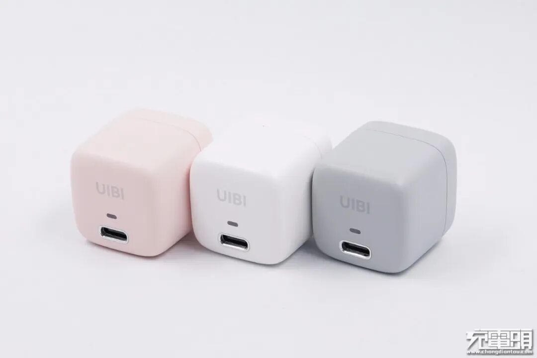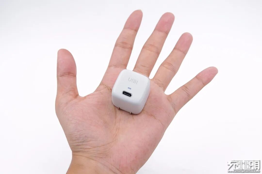 我上手的第一印象是小巧可爱,不管是出差还是旅游,都非常方便携带,不怎么占空间。这个面带有一个UIBI的灰色logo,下面是充电指示灯。最下方的USB-C接口处做了一圈金属环绕,让一个小小的充电头整体显得非常精致,尤其是细节的把控可以说十分到位。