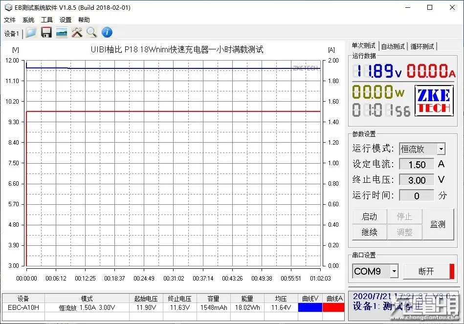 按照额定功率12V 1.5A满载进行稳定性测试,测试时间为一小时,测试过程中电压值呈水平直线,无明显波动情况,长时间满载也十分稳定。