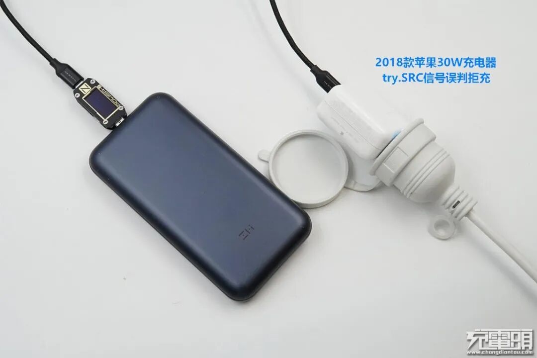 但2018年发布的30W USB-C与部分设备存在兼容不佳的问题,通讯过程中会因为try.SRC信号将需要接收电力的目标设备判断成输出电力的充电器而拒绝充电。在充电头网多年的兼容性评测中,苹果30W充电器的确对很多设备无法正常充电,证实了2018款苹果30W USB-C充电器存在普遍性的该兼容问题。
