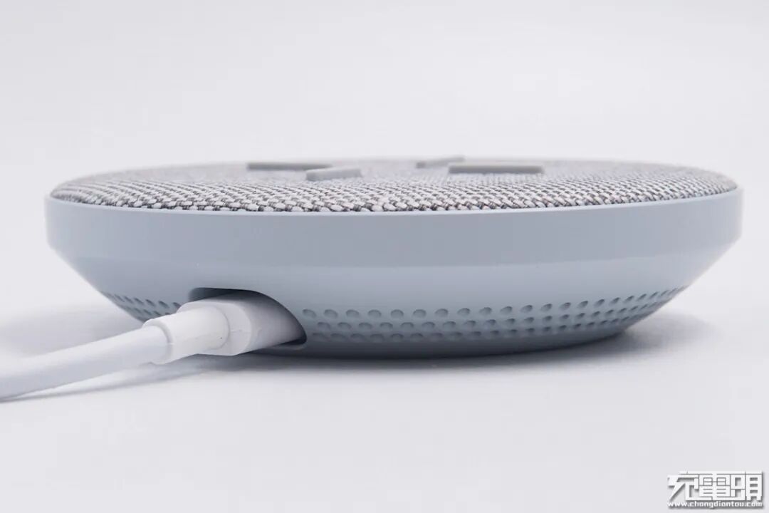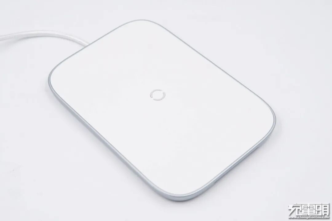 接口采用嵌入式设计,充电线看上去更美观。LED指示灯位于一侧,当通电并进行输出时,亮白色光源。输入接口位于对侧,类型为正反可插的USB-C。支持普通5W、苹果7.5W和三星10W,以及华为27W超级无线快充。