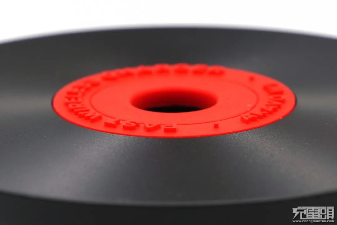 无线充电器顶面最外圈区域有许多细小的凹凸圆环组成,犹如黑胶唱片的“片纹”,带来不错的手感,另外在不同的光线角度下,能带来多种多样的视觉感受。红色一圈为软胶材质,防滑性强,上方有浮雕字样“AKAVO W1”与“FAST WIRELESS CHARGER”,寓意为:开物W1快速无线充电器。