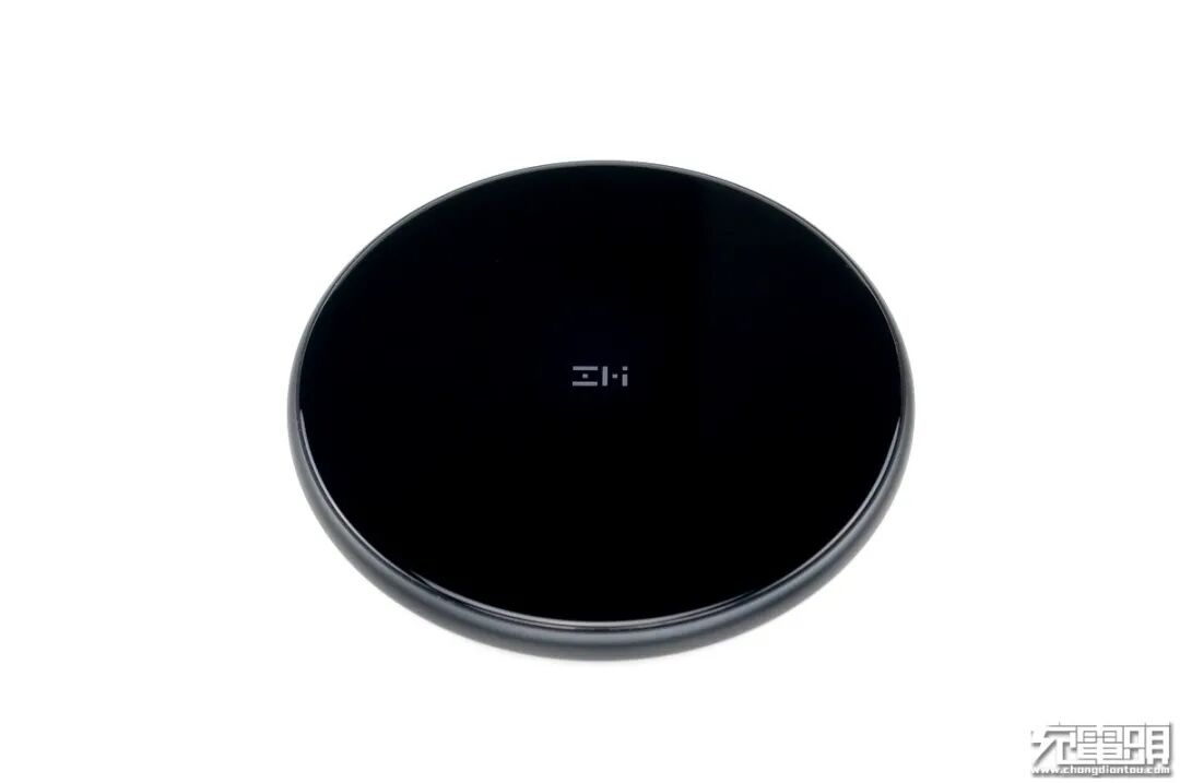 紫米无线充电器主体是全黑基调,面板使用了黑色lens 2.5D玻璃制作而成,硬度高可以抗划痕,面板中间是紫米“ZMI”LOGO。