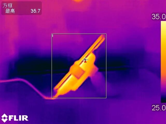 对紫米无线车充的温升进行测试,测试条件为在温度约为25℃的恒温箱中以7.5W的功率持续输出一小时的温升情况进行测试,一小时后,整体温度差别不是太大,当前最高温度点在手机放置的车充支架中上部,为35.7℃,温升上升了5.3℃。