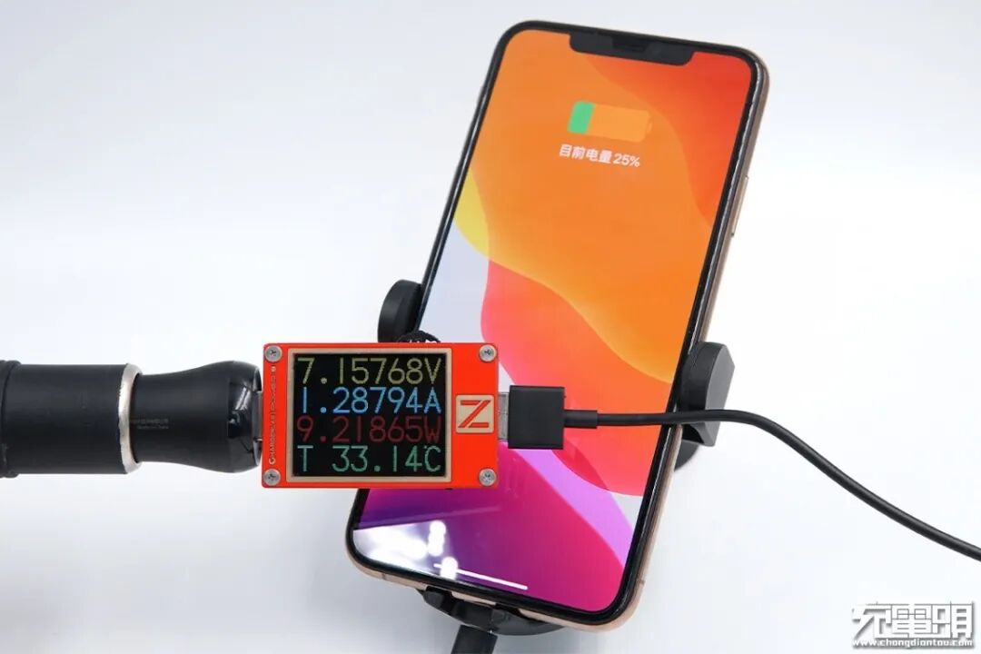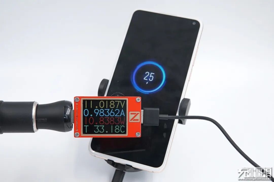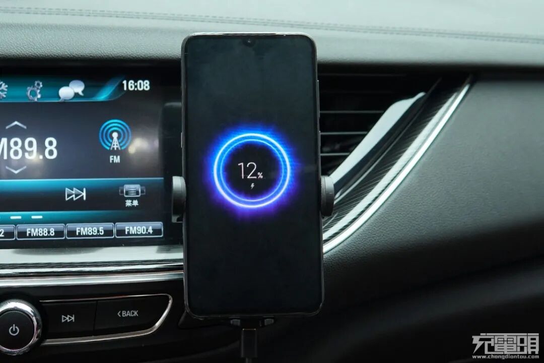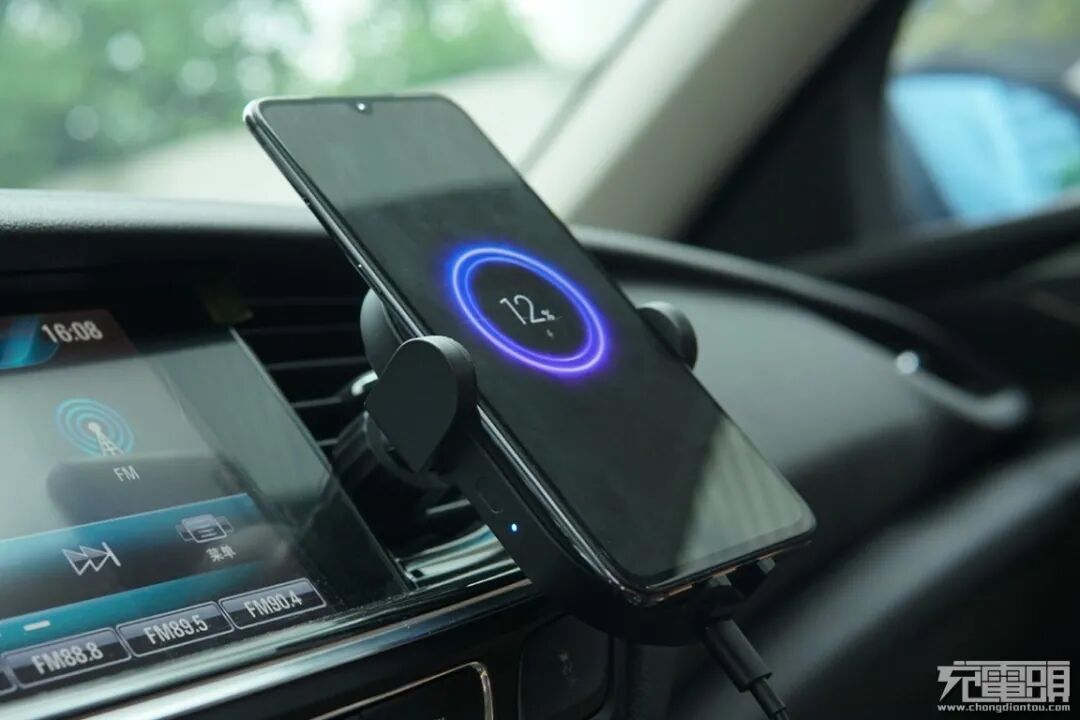 为了获得真实的用户体验,我们将这套无线车充安装在车上进行测试,手机正在使用无线车充进行充电。