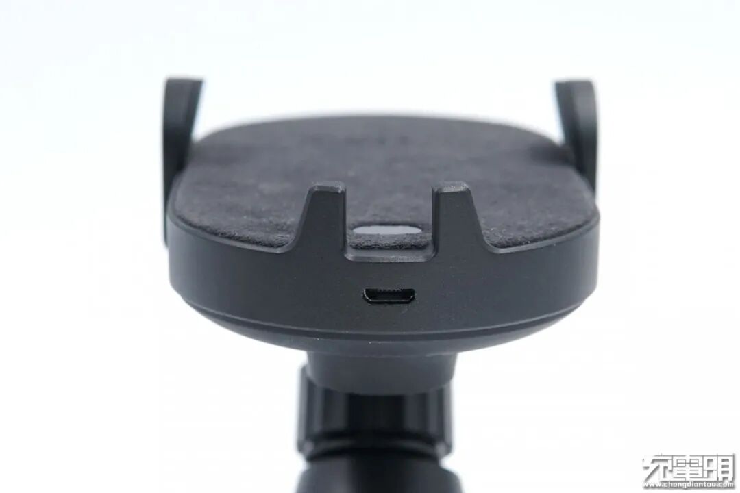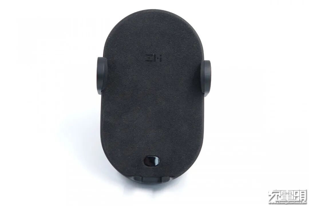 无线充电器采用赛道形状的圆润造型, 机身两侧以及底部设有夹臂,可以根据感应自动伸缩,后面我们会进行演示。