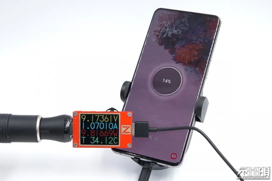 三星 S20 Ultra 5G支持15W无线充电,使用紫米无线车充为其充电,USB-A端口输出功率为9.17V 1.07A 9.81W