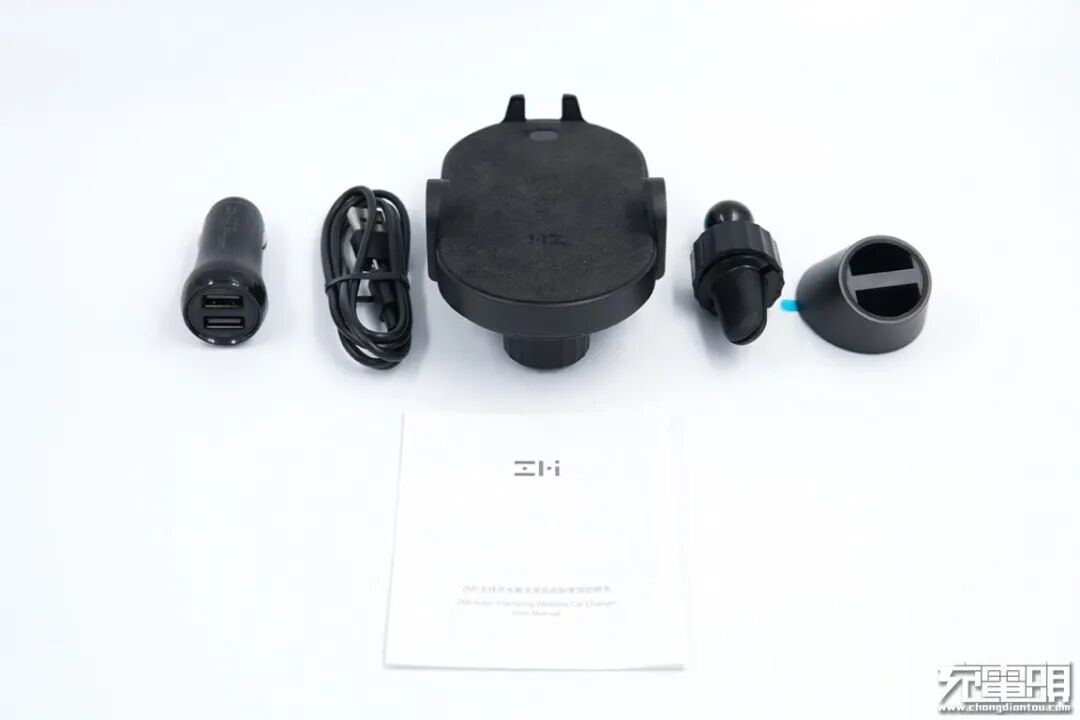 盒中物品全部取出摆好,从左到右分别是车充、充电线、车载无线充、连接装置、固定装置,它们下面是说明书。