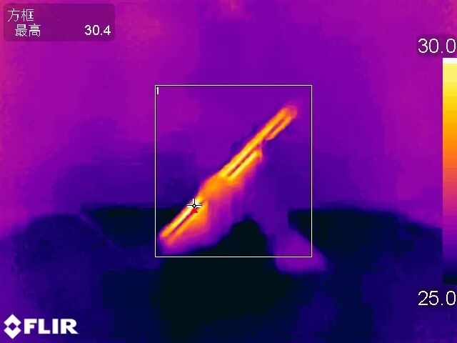 在25℃的恒温箱中,紫米无线车充预备开始给iPhone 11 Pro Max充电时使用FLIR热成像仪拍摄充电器发热情况,最高为30.4℃。