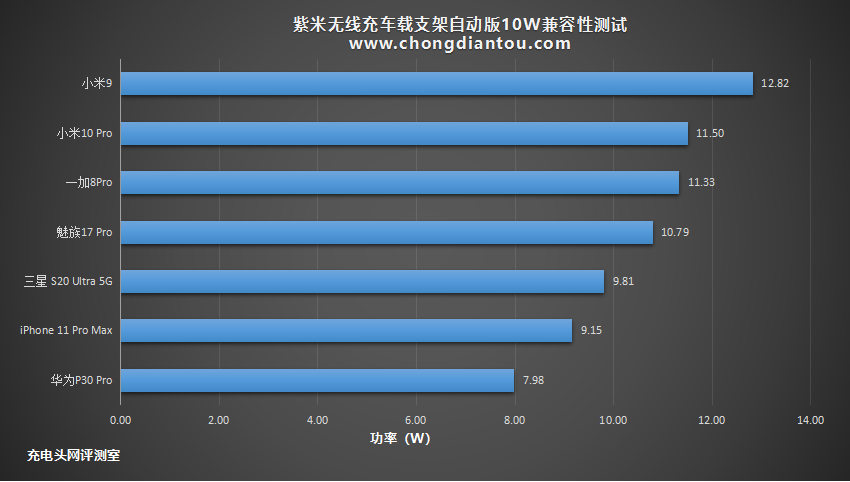 为了方便读者查阅,我们将数据整理成表格。可见所有测试的手机都能进行无线充电,功率都在10W左右。
