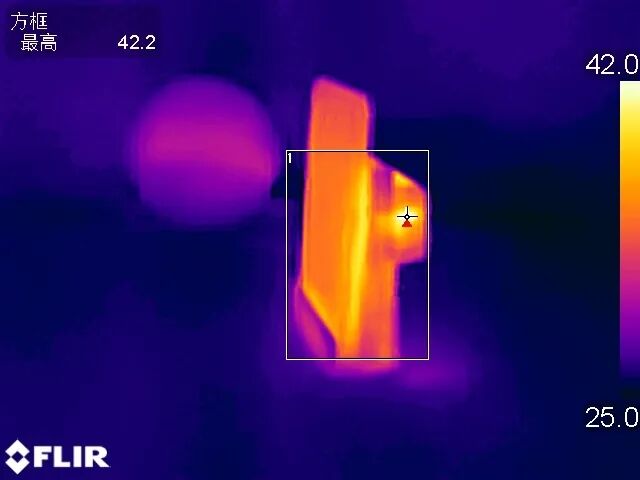 对充电器的温升进行测试,测试条件为在约25℃的恒温箱的温升进行测试,使用FLIR热成像仪拍摄iPhone11 Pro使用无线插座发热情况,一小时后当前最高温在背面突出部为42.2℃,温度上升了约16.5℃左右。