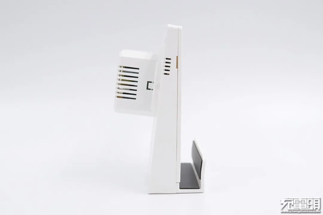 再从充电器顶部俯视,中间是充电板,上面是底座,下面是需要嵌入到墙壁的突出部分,几排镂空竖条应是散热所用,想来是不需要展露在外,不必在意美观与否。