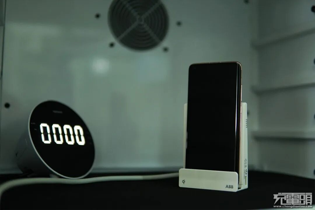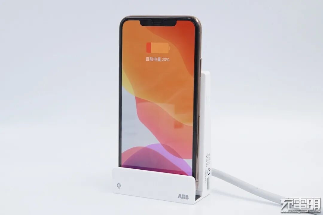 回到正面,充电背板有两个圆圈,形似“8”字,应是双线圈设计,横竖都能放,后面我们会进行测试。往下看,左边印有“Qi”,支持Qi无线充电协议之意,右边是“ABB”,与左边图案呼应,有对称之美。