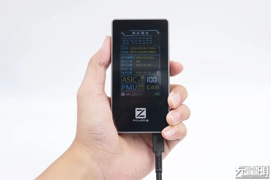 端子头是C48材质,可以全兼容iOS的系统的移动设备,包括iPhone、iPad、iPod Touch等,不会出现弹窗不兼容的问题。使用ChargerLAB Power-Z MF001测试仪对线材的Lightning端子头进行检测,从测试仪的屏幕中可以看到,该款数据线为原装C48,评分为100分。