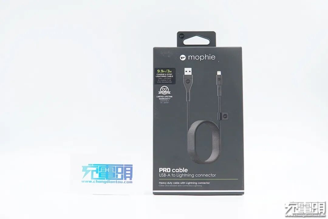 包装整体为黑色纸壳包装,盒子顶部为mophie品牌LOGO,左侧标有线材长度为9.9英尺/3米,中间为线材渲染图。