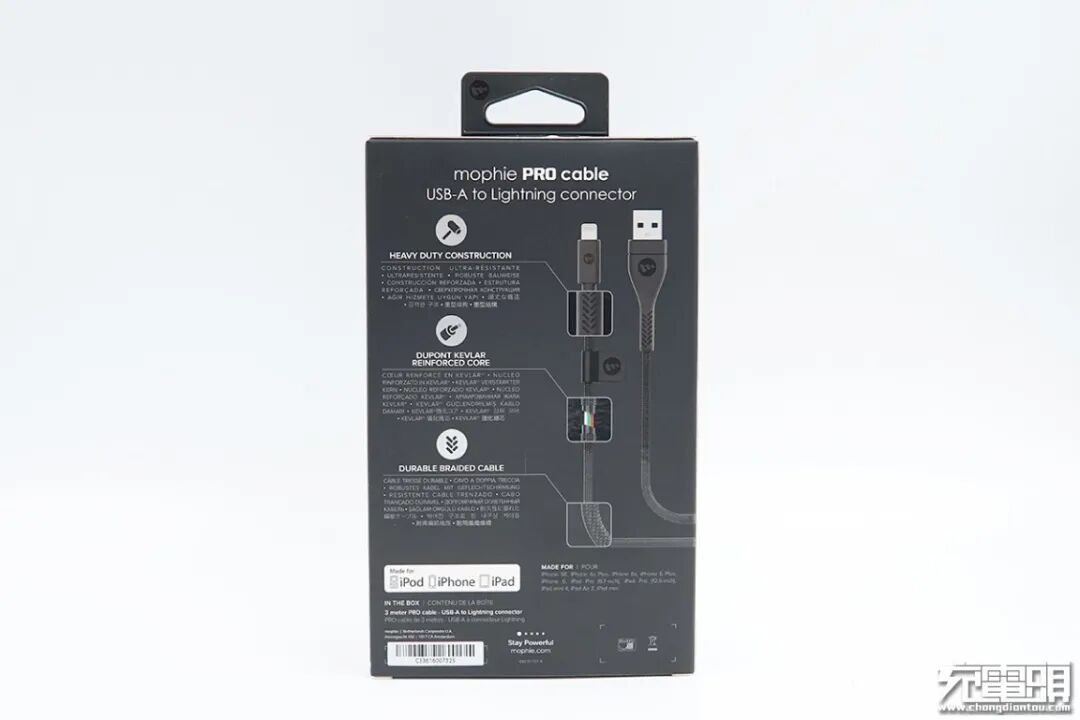 包装背面展示了三个主要卖点,分别是线尾部为重型结构、强化纤芯、耐用编织线,并且通过FMi认证。带有MFi认证的A to Lightning线材,通常都会采用原装C48端子头,iOS系统全兼容,安全使用不弹窗。
