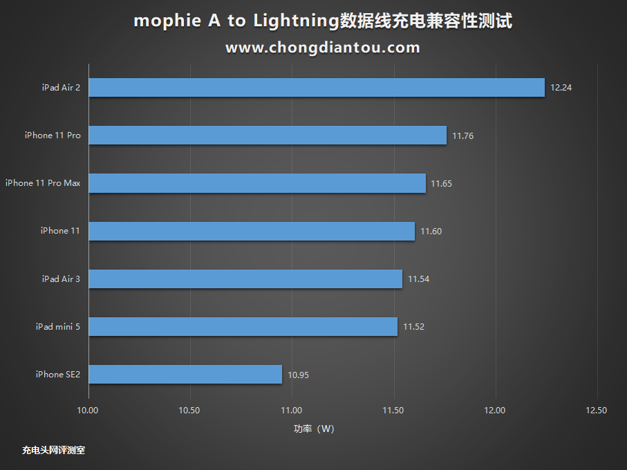 将三款iPad和四款手机的充电数据整理到柱状图当中, 从柱状图上可以看出,iPhone手机均成功握手Apple2.4快充协议,并且功率均达到了充电功率的最大阶段。