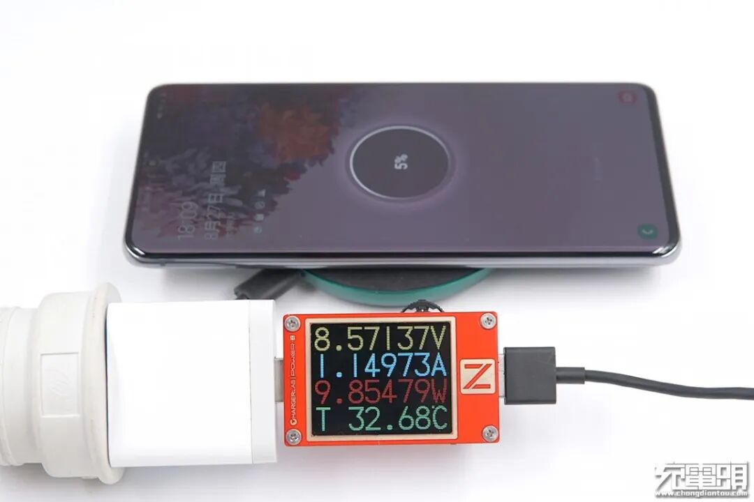 三星 S20 Ultra 5G支持15W无线充电,使用紫米10W无线充为其充电,USB-A端口输出功率为8.57V 1.14A 9.85W