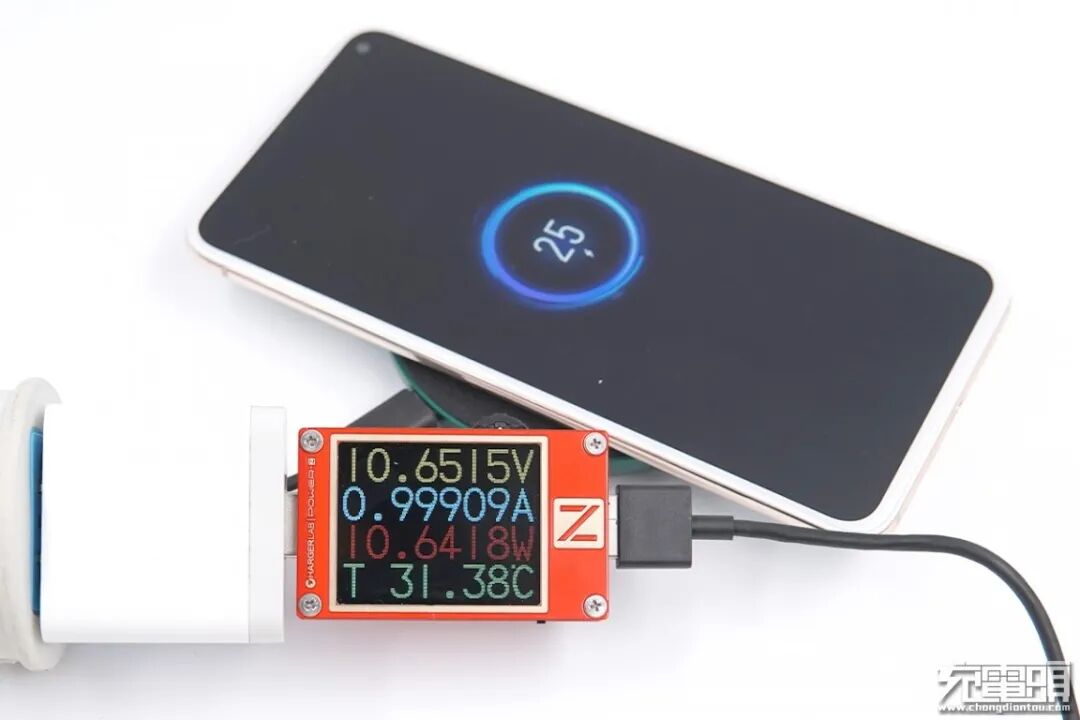 魅族17 Pro支持27W Super wireless mCharge 无线超充(需要魅族配件),使用紫米10W无线充为其充电,USB-A端口输出功率为10.65V 0.99A 10.64W。