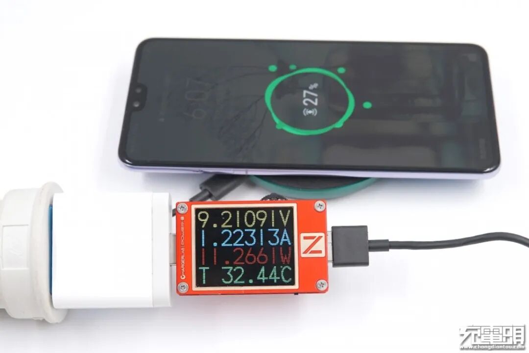 华为Mate30支持27W无线充电,兼容Qi协议,使用紫米10W无线充为其充电,USB-A端口输出功率为9.21V 1.22A 11.26W。