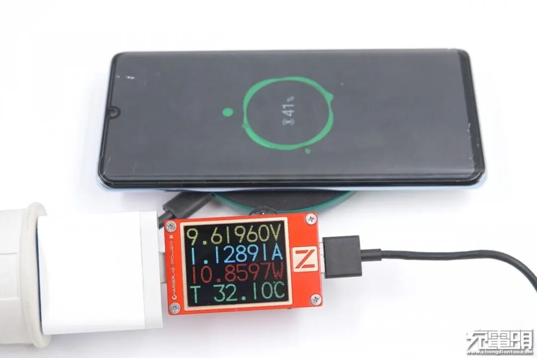 华为P30 Pro最大支持15W无线快充,兼容Qi协议,使用紫米10W无线充为其充电,USB-A端口输出功率为9.61V 1.12A 10.85W。