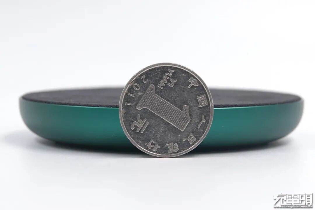 将一元硬币靠在无线充上,肉眼看去无线充的厚度只有硬币直径的一半。
