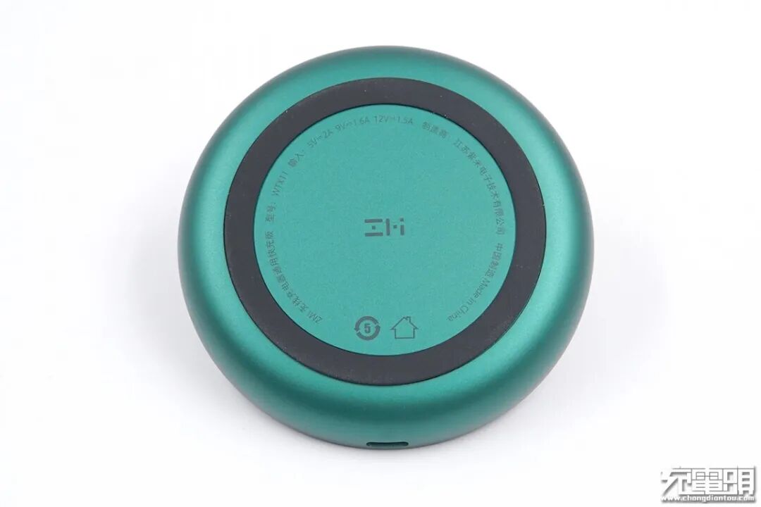无线充底部元素较为统一,圆形防滑垫内部参数信息也呈环状分布。中心处为“ZMI”字样与正面的字样位置一致,交相呼应。