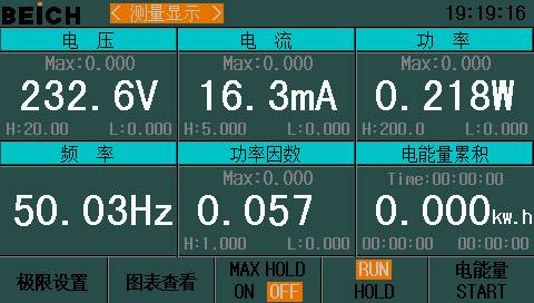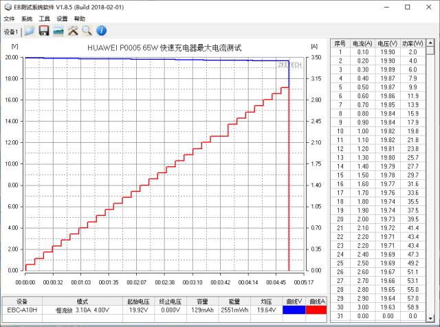 使用EB程控电子负载测试华为65W 1A1C 氮化镓充电器的最大输出功率,以0.1A为电流步进幅度,10秒为时间间隔,最终录得最大输出为19.63V 3.00A 58.9W。