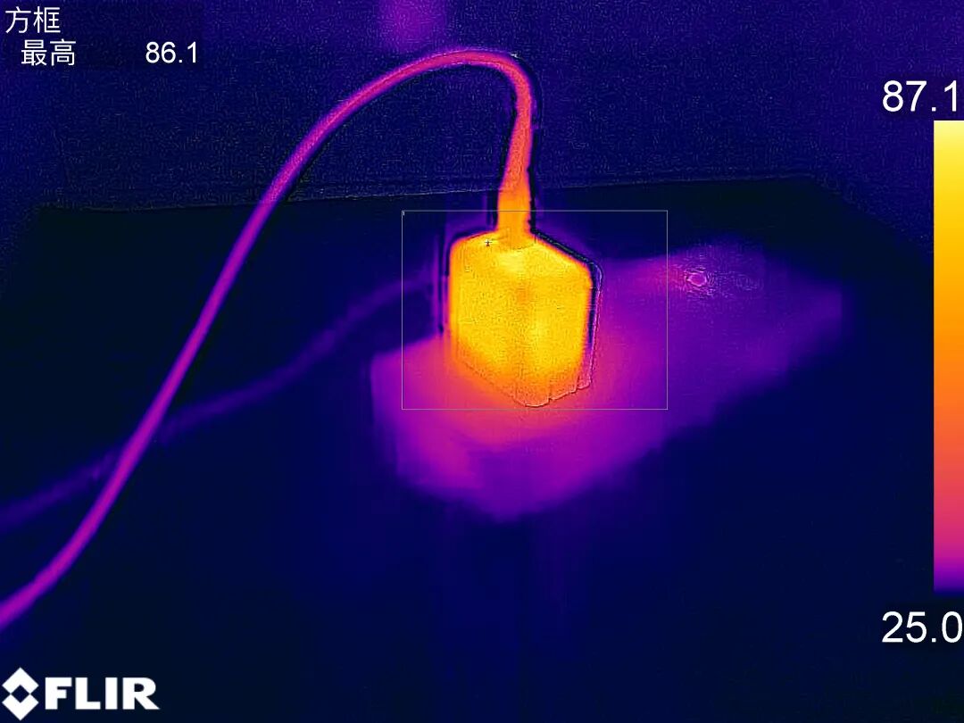 一小时后,当前最高温度为86.1℃,温度上升了61.1℃,高温集中在充电器上端,整体比较均匀。