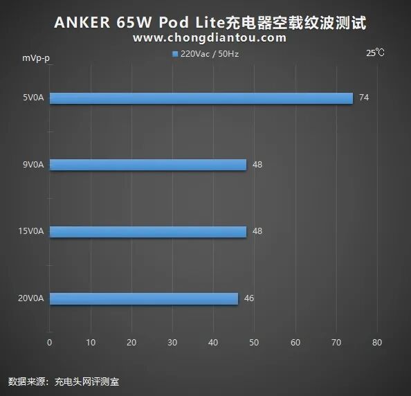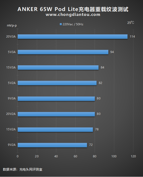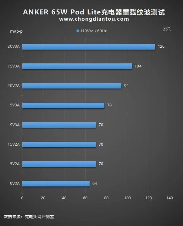 国家标准中充电器纹波要求是不高于200mV,Anker安克 PowerPortⅢ 65W Pod Lite充电器在110V 60Hz、220V 50Hz输入电压下,所有输出功率纹波峰峰值均低于200mV这个标准很多,表现不错。