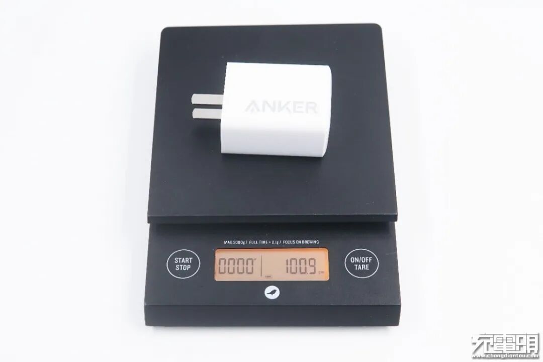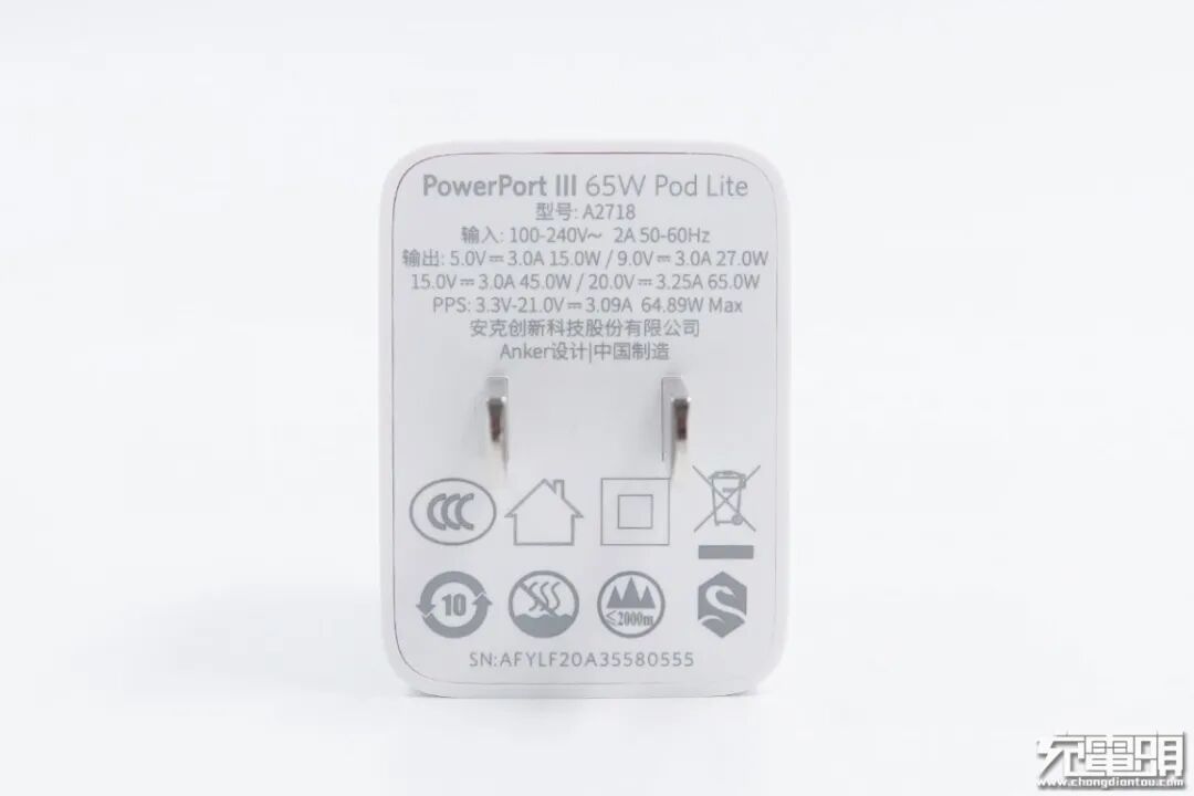 Anker安克 PowerPortⅢ 65W Pod Lite充电器机身边缘采用圆角处理,周身没有棱角,比较圆润,机身壳使用白色PC阻燃材质,表面磨砂处理,增加了摩擦。充电器的体积参数为29.84mm×52.08mm×40.60mm。功率密度约为1.04/cm³,净重约为100.9g。作为一款非氮化镓充电器,这个体积值得骄傲。