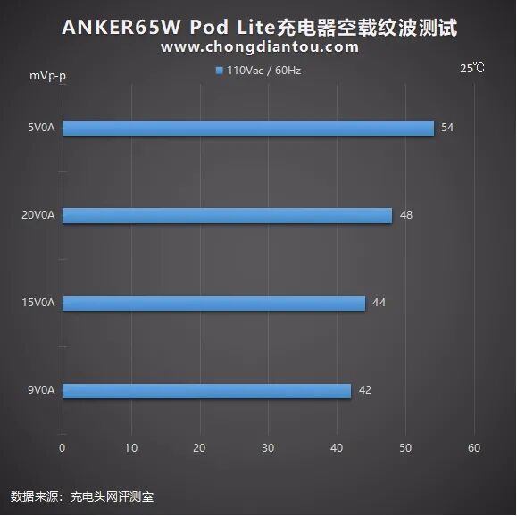 Anker安克 PowerPortⅢ 65W Pod Lite充电器在110V 60Hz交流输入的情况下进行了空载与重载的纹波测试,测试结果如下: