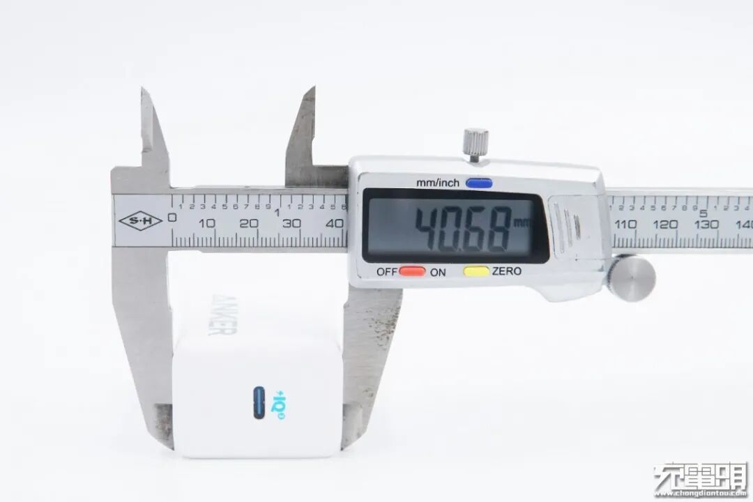使用游标卡尺测得ANKER 65W Pod Lite充电器的宽度为29.84mm。