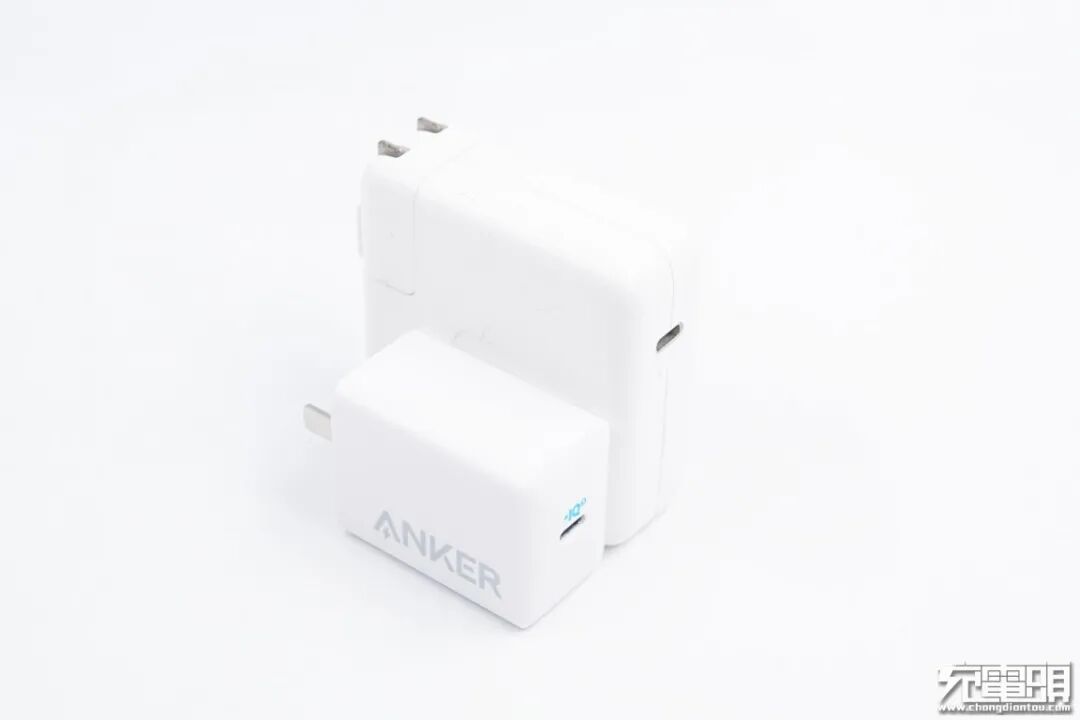 将充电器和苹果61W充电器放在一起对比一下大小,可以看出整个充电器相较于苹果的61W充电器要小一半多。与市面上很多同等规格的氮化镓充电器非常接近。