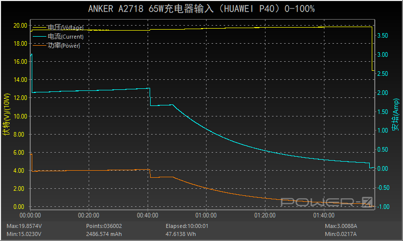 使用Anker安克 PowerPortⅢ 65W Pod Lite充电器为华为 P40 Pro充电,开始时便握手了20V 3A充电档位,短时间内电流迅速下降到2A级别,随后以缓慢上升姿态直到40分;随后电流迅速下降至1.7A;48分后,功率随着电流的逐渐下降而下降直至充电结束,全程耗时约2小时,最高功率为19.31V 3A 58.12W。