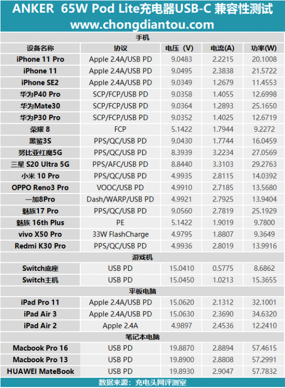 为了方便大家查阅,我们将所有测试数据整理到表格中。三款笔记本的充电功率自然最高,努比亚红魔5G手机成功握手PPS快充协议,一加8 Pro和OPPO Reno3 Pro成功握手PD快充,并达到快充功率的最大阶段。其余支持PD快充的苹果设备和安卓设备均成功握手PD快充协议。