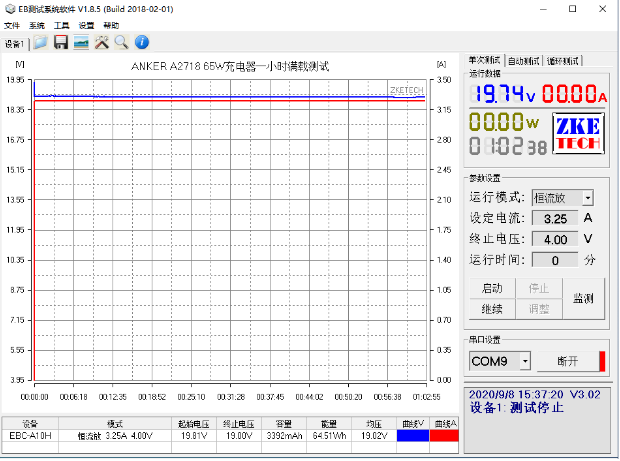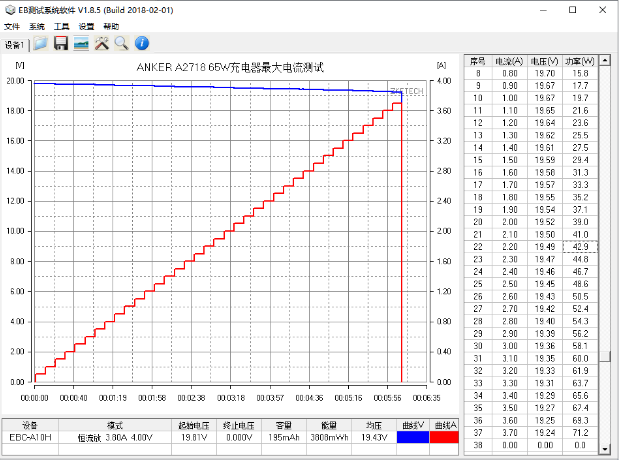 使用EB程控电子负载测试Anker安克 PowerPortⅢ 65W Pod Lite充电器的最大输出功率,以0.1A为电流步进幅度,10秒为时间间隔,最终录得最大输出为19.24V 3.70A 71.2W。