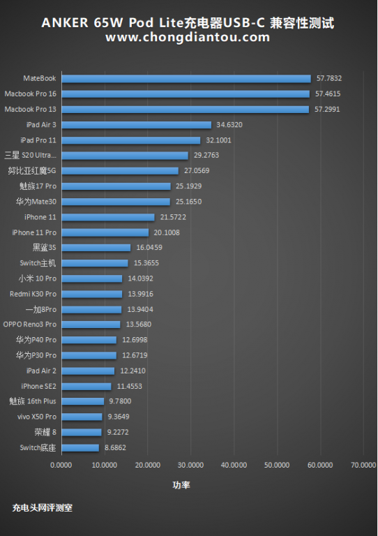 将USB-C输出兼容性的测试数据放在柱状图中,三台笔记本的充电功率排名最高,都在57W以上,魅族16th Plus、vivo X50 Pro、荣耀8、Switch底座的功率最低,都不到10W。